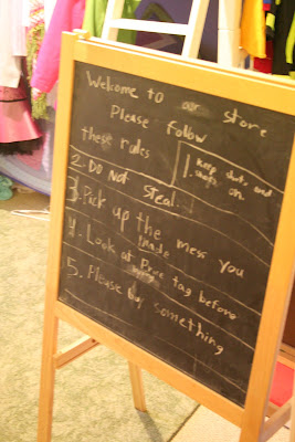 And opened the door to discover that we have apparently set up a thrift store in our house - with rock bottom prices I might add! Laurianna had taken the time to cut out price tags and tape them onto each article of clothing and was eagerly awaiting customers.